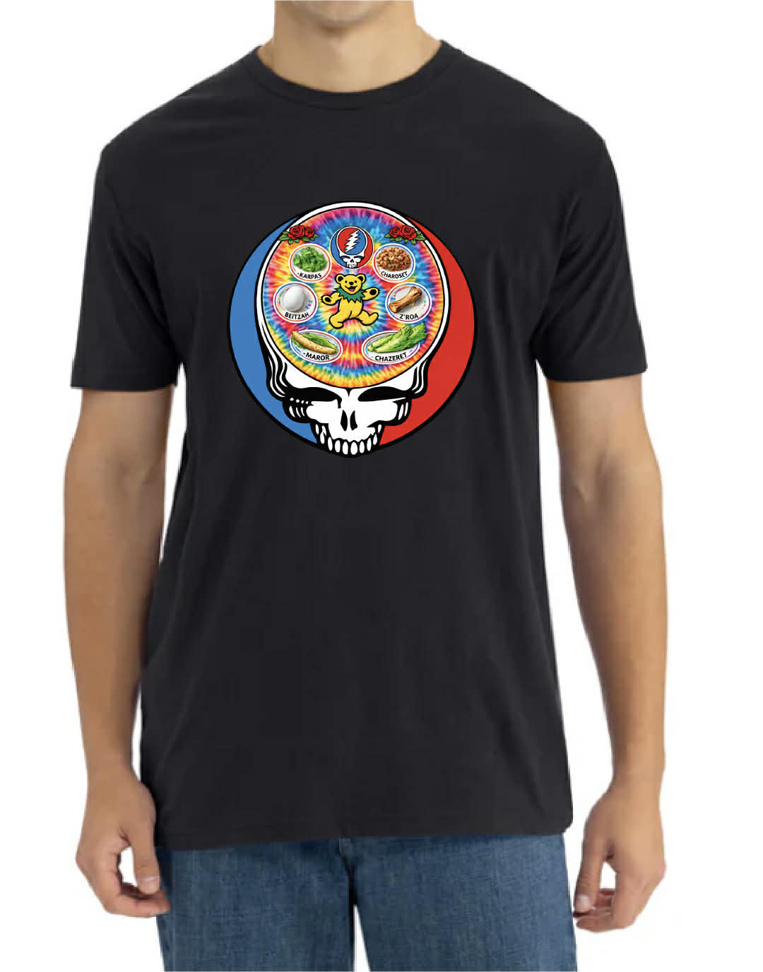 This tee features a familiar steal-your-face–inspired design with a seder plate at the center!